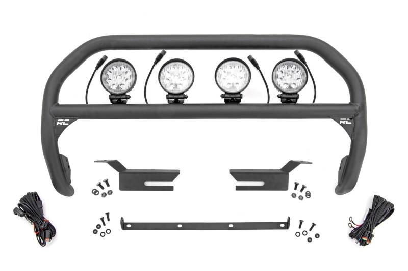 Outfit your 2021 Bronco right with Rough Country's Nudge bar. This durable 3-inch thick tubular steel bull bar provides unbeatable protection for the front side of your vehicle all while offering multipe LED mounting solutions to provide ample lighting for the trail ahead.\ \ This easy-to-install bull bar features a 100% bolt-on installation process, giving you a simple way to add this eye-catching upgrade that provides protection from hazards on and off-road. Each Nudge Bar is coated with corrosion-resistant black powder coat to ensure a long-lifespan for years to come.\ \ Rough Country's Nudge Bar can be equipped with four round LED lights, or a single row 20" LED light bar! Rough Country's all-weather LED lights feature a durable, die-cast aluminum housing and include a premium, waterproof, flat-wound, braided wiring harness with toggle switch and in-line fuse.
