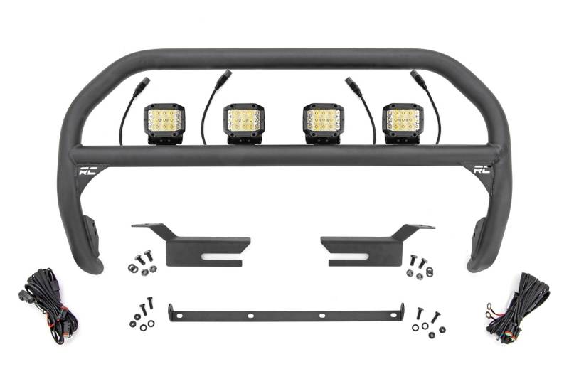 Outfit your 2021 Bronco right with Rough Country's Nudge bar. This durable 3-inch thick tubular steel bull bar provides unbeatable protection for the front side of your vehicle all while offering multipe LED mounting solutions to provide ample lighting for the trail ahead.\ \ This easy-to-install bull bar features a 100% bolt-on installation process, giving you a simple way to add this eye-catching upgrade that provides protection from hazards on and off-road. Each Nudge Bar is coated with corrosion-resistant black powder coat to ensure a long-lifespan for years to come.\ \ Rough Country's Nudge Bar can be equipped with four round LED lights, or a single row 20" LED light bar! Rough Country's all-weather LED lights feature a durable, die-cast aluminum housing and include a premium, waterproof, flat-wound, braided wiring harness with toggle switch and in-line fuse.