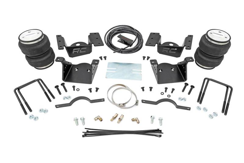 Ideal Leveling: Is your truck your workhorse? The main attraction of a pickup is the ability to haul and tow as needed. However, due to the weight in the bed or the condition of the rear leaf springs, your vehicle may become un-level under load. At Rough Country, we've designed a solution to eliminate these concerns. Introducing Rough Country's Rear Air Spring Kit.Heavy-Duty Construction: Rough Country's Rear Air Spring Kit includes two high-quality, double convoluted air bags, reinforced with durable powder-coated steel brackets and DOT-approved airlines. Whether you're towing a trailer or hauling heavy loads, this kit helps ensure your vehicle remains level, alleviating the strain on your trailer's tongue weight. The kit features 1/4" push-to-connect air fittings for easy installation, along with all necessary bracketry for a secure fit. Rough Country's Air Spring Kit supports up to 5,000 lbs of load, minimizing sway and preventing bottoming out while braking and steering. Easy Installation: Quick and simple setup for immediate use. Rough Country's kit can be installed at home with standard tools in just 5-6 hours, ensuring minimal downtime and fast, hassle-free installation.Onboard Air Compressor and Wireless Controller: For added convenience, Rough Country offers an optional onboard air compressor and wireless controller to easily adjust your air spring kit on the go. Control air pressure at the push of a button from the comfort of your vehicle.Reliable Warranty Coverage: Rough Country's Rear Air Spring Kit includes a limited lifetime warranty on the air springs and a two-year replacement warranty on the compressor, offering lasting protection against manufacturer defects. This industry-leading coverage ensures confidence in both quality and durability, so you can count on Rough Country to keep your truck performing at its best.