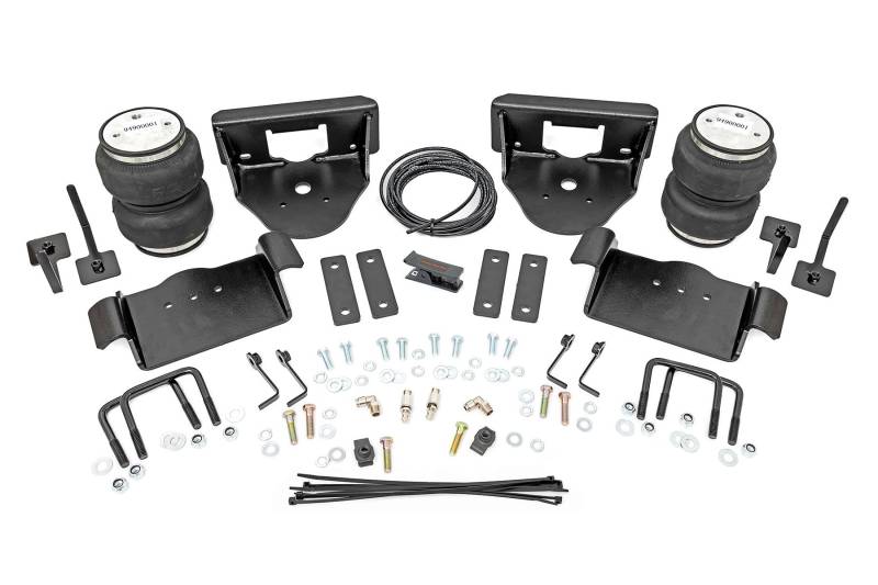 Ideal Leveling: Is your truck your workhorse? The main attraction of a pickup is the ability to haul and tow as needed. However, due to the weight in the bed or the condition of the rear leaf springs, your vehicle may become un-level under load. At Rough Country, we've designed a solution to eliminate these concerns. Introducing Rough Country's Rear Air Spring Kit.Heavy-Duty Construction: Rough Country's Rear Air Spring Kit includes two high-quality, double convoluted air bags, reinforced with durable powder-coated steel brackets and DOT-approved airlines. Whether you're towing a trailer or hauling heavy loads, this kit helps ensure your vehicle remains level, alleviating the strain on your trailer's tongue weight. The kit features 1/4" push-to-connect air fittings for easy installation, along with all necessary bracketry for a secure fit. Rough Country's Air Spring Kit supports up to 5,000 lbs of load, minimizing sway and preventing bottoming out while braking and steering. Easy Installation: Quick and simple setup for immediate use. Rough Country's kit can be installed at home with standard tools in just 5-6 hours, ensuring minimal downtime and fast, hassle-free installation.Onboard Air Compressor and Wireless Controller: For added convenience, Rough Country offers an optional onboard air compressor and wireless controller to easily adjust your air spring kit on the go. Control air pressure at the push of a button from the comfort of your vehicle.Reliable Warranty Coverage: Rough Country's Rear Air Spring Kit includes a limited lifetime warranty on the air springs and a two-year replacement warranty on the compressor, offering lasting protection against manufacturer defects. This industry-leading coverage ensures confidence in both quality and durability, so you can count on Rough Country to keep your truck performing at its best.