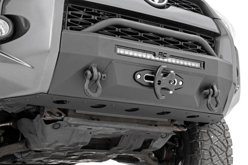 - Rugged Durability: Finished in a corrosion-resistant black powder coat to withstand the elements and trail abuse.\ Winch-Ready Design: Comes with a heavy-duty winch mounting plate for reliable recovery and off-road readiness.\ Integrated Stinger Bar: Adds extra front-end protection while giving your 4Runner an aggressive, off-road-ready look.\ Fully Modular: Customize your bumper with the exact configuration that fits your style and performance needs.\ High-Performance LED Lighting Options: Choose from three configurations of Rough Country's 20-Inch LED Light Bar: standard (no DRL), with amber DRL, or with white DRL, delivering 7200 lumens of powerful trail illumination.\ Recovery-Ready: Includes reinforced D-Ring mounts and heavy-duty D-Rings for dependable towing and recovery..
