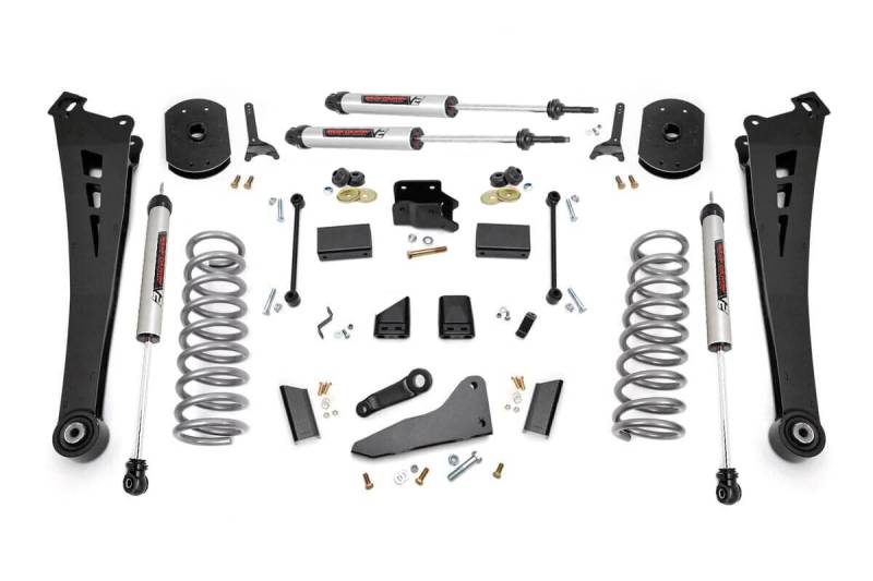 Compliment your RAM 2500's aggressive, good looks with Rough Country's new 5-inch Lift Kit with lifted coil springs. New model RAM Trucks come with a wealth of impressive features right from the factory. Rough Country's new 5-inch kit was engineered to retain these impressive factory specs while bumping up performance and durability where it's needed most. The result is a lifted beast with a mean profile and lush ride-quality that'll make other RAM owners wonder where you got yours from!Rough Country's 5-inch Lift Kit is designed for Dodge RAM's equipped with either factory rear coils or factory rear air ride suspension. On Air Ride models, this kit uses a rear air bag spacer that works with the factory air bag to provide rear lift. This kit also features a Rear Sensor Arm Relocation Bracket that can modify how the sensor link speaks to the computer to determine what the ride height is. This allows you to adjust the amount of rear height up to 1-inch higher than the front by way of multiple mounting points spaced by 1/4-inch. Pick the mounting point you want for the rear ride height you prefer.When changing a vehicle's suspension, the key to preserving ride quality is in keeping the geometry of all suspension components as close to their factory angles as possible. Rough Country's new 5-inch Suspension kit features a set of ultra-durable Radius Arms, precision fit to bolt right into the factory mounts for an easier install and a more factory-like angle. These beefy, upgraded Radius Arms also feature a durable, durable rubber bushings for maximum vibration absorption. This kit also includes a set of front, lifted coil springs for unparalleled ride quality from your lifted Dodge Ram.
