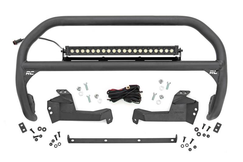 Outfit your 2021 Bronco Sport right with Rough Country's Nudge bar. This durable 3-inch thick tubular steel bull bar provides unbeatable protection for the front side of your vehicle all while offering multipe LED mounting solutions to provide ample lighting for the trail ahead.\ \ This easy-to-install bull bar features a 100% bolt-on installation process, giving you a simple way to add this eye-catching upgrade that provides protection from hazards on and off-road. Each Nudge Bar is coated with corrosion-resistant black powder coat to ensure a long-lifespan for years to come.\ \ Rough Country's Nudge Bar can be equipped with four round LED lights, or a single row 20" LED light bar! Rough Country's all-weather LED lights feature a durable, die-cast aluminum housing and include a premium, waterproof, flat-wound, braided wiring harness with toggle switch and in-line fuse.