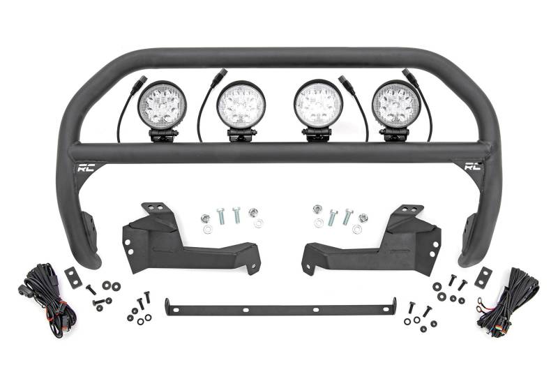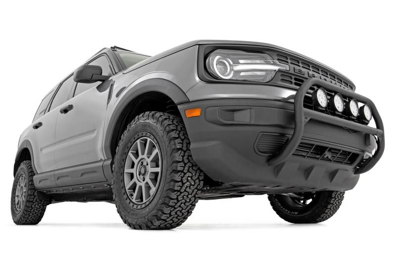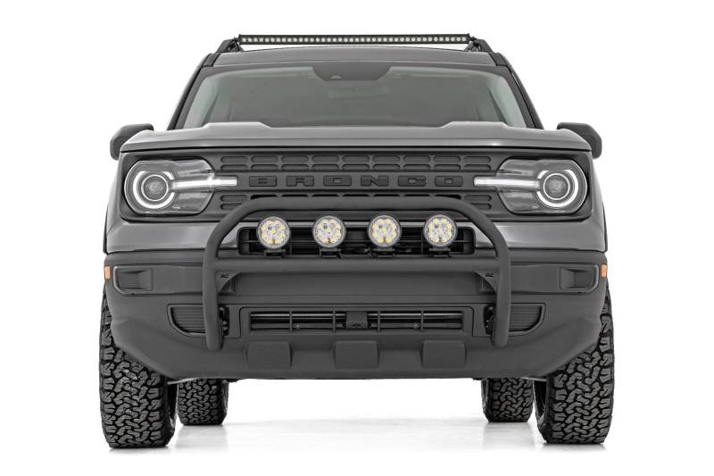 Outfit your 2021 Bronco Sport right with Rough Country's Nudge bar. This durable 3-inch thick tubular steel bull bar provides unbeatable protection for the front side of your vehicle all while offering multipe LED mounting solutions to provide ample lighting for the trail ahead.\ \ This easy-to-install bull bar features a 100% bolt-on installation process, giving you a simple way to add this eye-catching upgrade that provides protection from hazards on and off-road. Each Nudge Bar is coated with corrosion-resistant black powder coat to ensure a long-lifespan for years to come.\ \ Rough Country's Nudge Bar can be equipped with four round LED lights, or a single row 20" LED light bar! Rough Country's all-weather LED lights feature a durable, die-cast aluminum housing and include a premium, waterproof, flat-wound, braided wiring harness with toggle switch and in-line fuse.