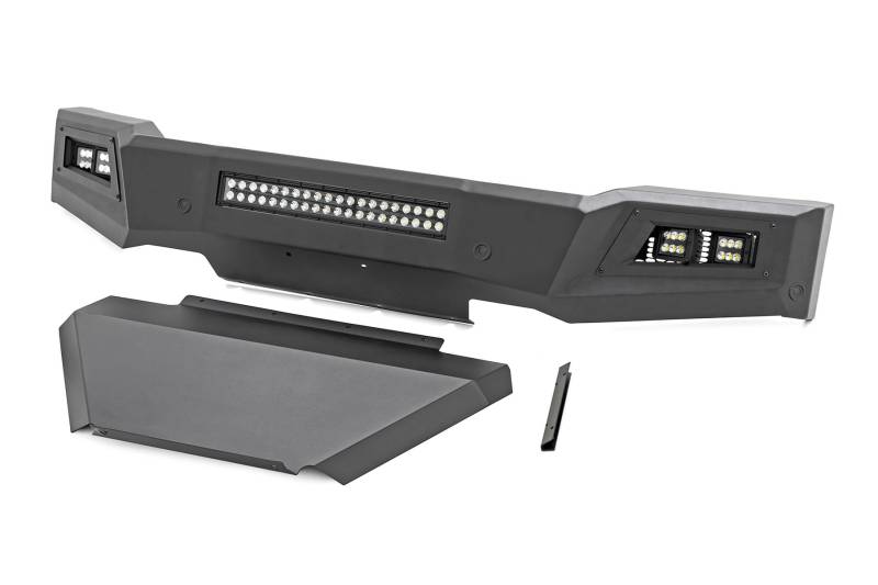 Aggressive High-Clearance Styling with Serious Trail Performance: Give the front of your Chevy Silverado 1500 a bold, off-road-ready appearance with Rough Country's Front High Clearance LED Bumper. Featuring a slim, factory-following profile and pre-runner inspired design, this bumper improves approach angles and trail clearance while maintaining a clean, performance-driven look that complements OEM body lines.Heavy-Duty Steel Protection Built for Real-World Abuse: Constructed from durable, all-steel materials, this front bumper is engineered to handle harsh terrain, road debris, and off-road obstacles with confidence. An integrated skid plate adds extra protection for vital front-end components, making this bumper as functional as it is aggressive.High-Output LED Lighting for Maximum Visibility: Light up the trail ahead with confidence thanks to four Rough Country Black Series 2-inch LED Cube Lights and a powerful 20-inch Dual Row LED Light Bar. Together, these lights deliver an impressive 19200 lumens of bright, focused illumination, improving visibility during night runs, low-light conditions, and off-road adventures.OEM-Compatible Design with Retained Factory Features: This bumper is designed to retain factory tow hooks and proximity sensors, ensuring full recovery capability and seamless integration with your Silverado's existing safety systems without compromise.Simple Bolt-On Installation with Warranty Protection: Designed for a straightforward bolt-on installation using factory mounting locations, this bumper installs with no cutting or drilling required. Finished in a durable flat black powder coat, it is built to withstand the elements for long-lasting performance and appearance. LED lights are backed by a 3-year warranty, the bumper finish includes a 1-year warranty, and the bumper itself is covered by a limited lifetime warranty against manufacturing defects for added peace of mind.