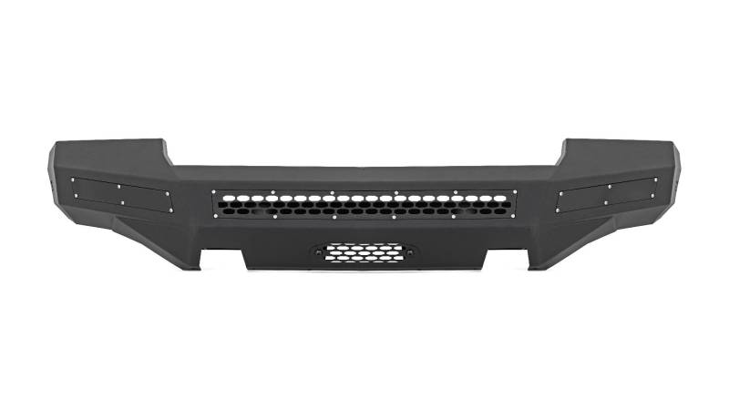 - High Clearance Pre-Runner Design: Engineered to improve approach angles and trail clearance, this bumper is built to handle off-road obstacles while maintaining a clean, performance-driven appearance.\ Fully Modular Configuration: Customize your setup with a modular design that allows you to choose the exact configuration that fits your build and driving needs.\ Non-LED Ready with Block-Off Panels: The non-LED configuration includes clean block-off panels, delivering a finished look while keeping the option open for future lighting upgrades.\ Optional High-Output LED Lighting Upgrade: Available with an LED kit featuring one 30-inch single row LED light producing 12000 lumens and two 10-inch slimline LED lights producing 8000 lumens for powerful forward-facing illumination.\ Integrated LED Trim Panels: Includes trim panels designed specifically to accommodate optional LED lights for a clean, factory-inspired appearance.\ Winch-Ready Capability: Equipped with a heavy-duty winch mounting plate engineered to accept Rough Country PRO Series winches for added recovery confidence on and off the trail.\ Durable Powder Coat Finish: Finished in a corrosion-resistant flat black powder coat to withstand harsh conditions, road debris, and off-road abuse..