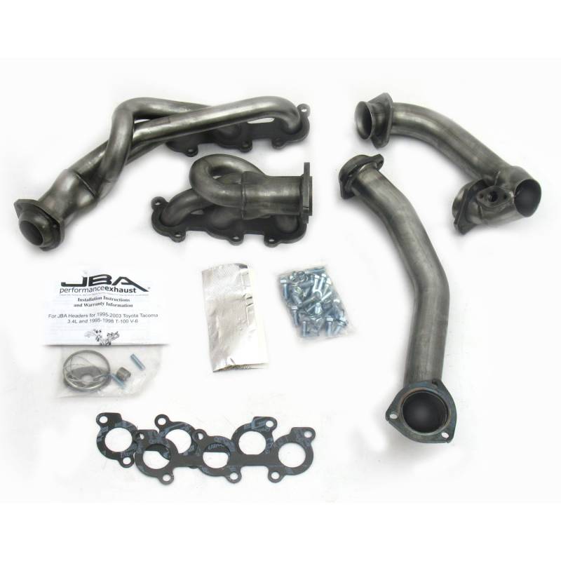 JBA shorty headers are one of the foremost performance upgrades you can bestow upon your beloved car, truck, or SUV. JBA Headers are significantly less restrictive than stock manifolds and dramatically increase the power and efficiency of your engine. Each header is constructed from durable stainless steel to endure the abuse of racing, towing, and daily driving – built to withstand it all. JBA’s proprietary Firecone collector design uses race proven technology for producing maximum power and torque gains where you drive most. Each system includes factory style emission connections and high-quality hardware for a professional no-leak installation.