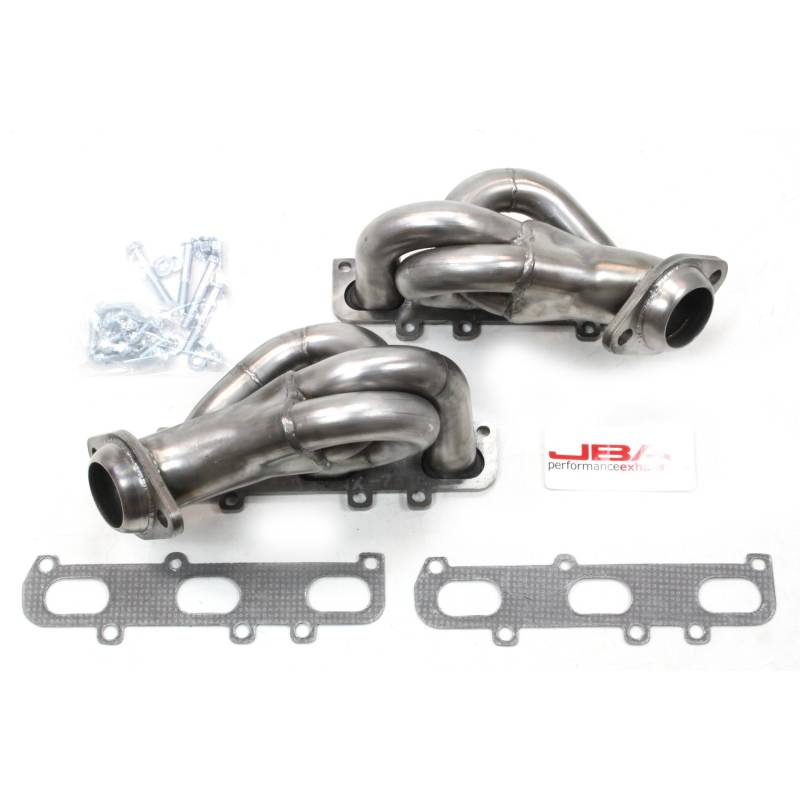JBA shorty headers are one of the foremost performance upgrades you can bestow upon your beloved car, truck, or SUV. JBA Headers are significantly less restrictive than stock manifolds and dramatically increase the power and efficiency of your engine. Each header is constructed from durable stainless steel to endure the abuse of racing, towing, and daily driving – built to withstand it all. JBA’s proprietary Firecone collector design uses race proven technology for producing maximum power and torque gains where you drive most. Each system includes factory style emission connections and high-quality hardware for a professional no-leak installation.