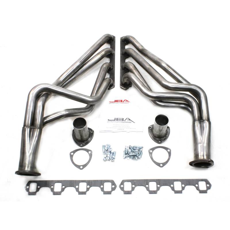 JBA long tube headers are the number one choice for maximum performance gains and high RPM efficiency. Available in 409 or 304 Series Stainless Steel. These long tube designs are dyno and race proven to deliver the greatest possible increase in horsepower and torque throughout the RPM range. All JBA long tube headers feature large mandrel-bent stainless steel primary tubes, oversized exhaust ports, extra thick 3/8 one-piece flanges, and proprietary JBA Firecone merged collectors for smooth flow. Each system is designed to give the maximum amount of ground clearance possible, so lowered cars do not drag the collectors.\n304 Series Stainless Steel headers are built to endure the harshest of environments, ensuring your investment stands the test of time. These headers are embellished with 304 flanges, longer, smoother 304 merged collectors and 304 primary tubing. Our proprietary JBA Firecone has been extended with a longer concave design within the collector for optimal flow. Available in natural finish or a meticulously hand polished mirror finish.\nEach system includes high quality hardware and thorough instructions for a professional no-leak installation. For closed course competition use only.