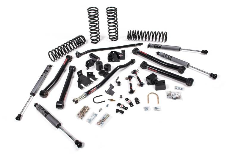 J-Konnect 3.5" Lift Kit Upgrade your Jeep® Wrangler JK 4 Door with a J-Konnect 3.5" suspension system to fit larger tires and increase off road capabilities. The J-Konnect kit includes dual rate coil springs, tuned gas shocks, adjustable front track bar, J-Link lower control arms, and sway bar Quicker Disconnects. While the entry level J-Venture systems is designed for equal parts on-road handling and off-road capability, J-Konnect takes strength and performance a step further by adding front and rear fixed length J-Link lower control arms. These lower control arms not only add front caster and rear wheelbase, they are a serious upgrade to the strength over the factory control arms. Built 2” x .250-wall DOM tubing while offering better NVH isolation with large factory style rubber bushings at both ends. The end result is aggressive off-road performance and strength while maintaining excellent on-road manners. Get connected with J-Konnect. Front/Rear Dual Rate Coil Springs designed for great ride quality and improved performance across any terrain Front/Rear JSPEC gas shocks specifically valved for this suspension system for improved performance on and off-road Front Adjustable Track Bar and Rear Track Bar Bracket to correct axle positioning under vehicle Front Sway Bar Quicker Disconnects and Brake Line Brackets to allow for increased offroad articulation Front/Rear J-Link Lower Control Arms for improved strength and caster correction