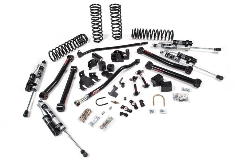 Upgrade your Jeep Wrangler JK 4 Door with a J-Konnect 3.5 inch suspension system to fit larger tires and increase off road capabilities. The J-Konnect kit includes dual rate coil springs, tuned gas shocks, adjustable front track bar, J-Link lower control arms, and sway bar Quicker Disconnects.