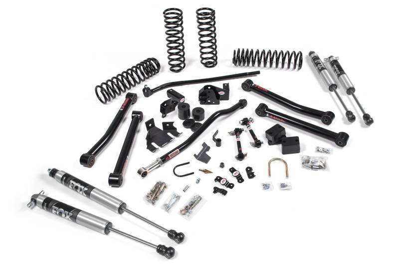 The J-Konnect kit includes dual rate coil springs, tuned gas shocks, adjustable front track bar, J-Link lower control arms, and sway bar Quicker Disconnects.