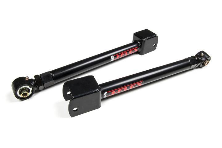 Adjustable Control Arms Upgrade your JK Wrangler's off-road capability with JKS J-Flex adjustable front upper Control Arms. CNC-bent from DOM tubing for proper tire, frame and axle mount clearance, J-Flex control arms feature forged "flex" ends that are adjustable. The design increases reliability and allows you to fine tune suspension geometry. The ends are also fully rebuildable and greaseable. With heavy duty 1/4"-12 threads and hex shaped weld-in threaded bung, tightening of the included jam nuts is super easy and secure. At the non-adjustable end, the mount is “boxed” for increased strength. Arms are powder-coated for a long-lasting finish. Sold in pairs. Adjustable arm design utilizing a forged adjustable flex end and jam nut Forged end is fully rebuildable and greaseable 1"-14 threads provide ultimate strength and fine-tune adjustability CNC formed for proper tire, frame and axle mount clearance