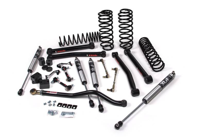 J-Konnect 3.5" Lift Kit Easy to install bolt on performance suspension to handle the toughest off road trails and drive you home after. These J-Konnect Systems build off the base J-Venture to add J-Link lower control arms for equal parts on-road handling and off-road capability and strength. These lower control arms not only add front caster and rear wheelbase, they are a serious upgrade to the strength over the factory control arms. Built 2” x .250-wall DOM tubing while offering better NVH isolation with large factory style rubber bushings at both ends. These combined with the dual rate coil springs, adjustable track bar, quicker disconnects and more offer improved trail performance and strength while catering to on-road handling needs. This particular kit features next level performance from the FOX 2.5 Performance Elite Series Shocks with DSC adjustment to deliver next level performance with easy adjustment to dial in high-speed/low-speed compression damping for improved performance across off terrains. Get connected with J-Konnect. Front/Rear Dual Rate Coil Springs designed for great ride quality across any terrain Front/Rear FOX 2.5 Performance Elite Series Shocks specifically valved for this suspension system for improved performance on and off-road Front Adjustable Track Bar and Rear Track Bar Bracket to correct axle positioning under vehicle Front Sway Bar Quicker Disconnects and Rear Sway Bar Links for increased offroad articulation Front/Rear Bump Stop Extensions to properly limit suspension up travel