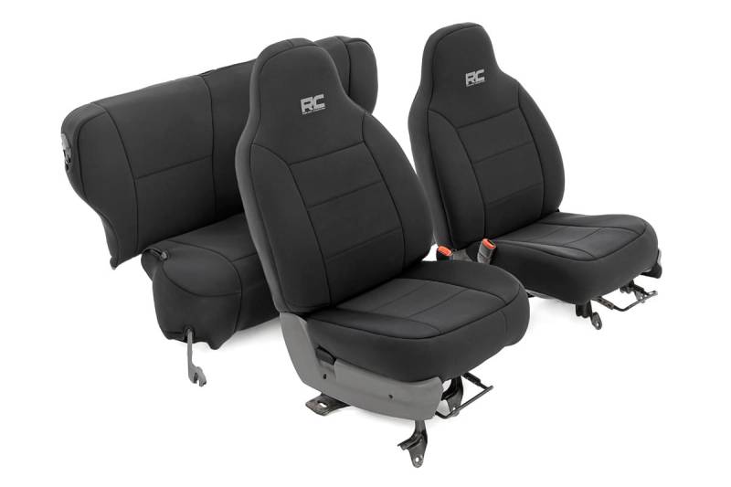 Want to protect your seats or are your seats showing signs of wear and tear from daily use? Say goodbye to unsightly stains and deterioration with Rough Country's Neoprene Seat Covers - the ultimate solution for preserving your vehicle's interior.Snug Fit for Optimal Protection: Our seat covers are tailored to fit your seats perfectly, providing a protective barrier against spills, scratches, and everyday wear and tear.Factory-Spec Construction: Engineered to meet factory specifications, our covers blend seamlessly with your vehicle's interior, giving it a fresh, new look without compromising on quality or style.Four-Layer Defense: With a four-layer construction featuring foam padding and a durable polyester shell, our seat covers offer unmatched protection and longevity, ensuring your seats stay looking new for years to come.Breathable and Water-Resistant: The neoprene layer not only provides breathability for added comfort but also boasts water-resistant properties, safeguarding your seats from spills and stains.Complete Coverage: Our covers come with full protection for your front seats, including headrest covers where applicable, as well as rear covers to shield your back seats from children and pet-related mishaps.Peace of Mind Warranty: Rest easy knowing your purchase is backed by our two-year warranty, giving you confidence in the durability and reliability of our product. Don't let worn-out seats diminish your driving experience. Upgrade to Neoprene Seat Covers today and enjoy a fresh, stylish interior that's protected against the rigors of daily life on the road.