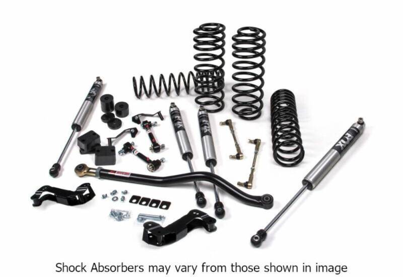 J-Kontrol 2.5" Lift Kit Increase the clearance and performance of your 4-Door Jeep Wrangler JL with a 2.5" lift J-Kontrol™ suspension system. It delivers exceptional stability on and off road. A step up from JKS J-Venture™ systems, J-Kontrol™ is a true bolt-on system that adds in front control arm correction brackets to the J-Venture Kit's long list of upgrade components including JSPEC dual-rate coil springs, custom-valved aluminum FOX 2.0 Performance Series gas shocks, an adjustable front track bar and rear track bar bracket (to correct axle positioning under vehicle), Quicker-Disconnect sway bar end links, front/rear Bump Stop Extensions and front Control Arm Correction Brackets to flatten upper/lower control arm angles. The supplied control arm brackets work with your Jeep's stock control arms to correct caster and improve handling. J-Kontrol offers enhanced performance for daily driving, beach cruising, or regular trail use. Front/Rear HD Dual Rate Coil Springs designed for great ride quality across any terrain Front/Rear FOX 2.0 Performance Series Gas Shocks specifically valved for this suspension system for improved performance on and off-road Front Adjustable Track Bar and Rear Track Bar Bracket to correct axle positioning under vehicle Front Sway Bar Quicker Disconnects and Rear Sway Bar Links for increased offroad articulation Front/Rear Bump Stop Extensions to properly limit suspension up travel
