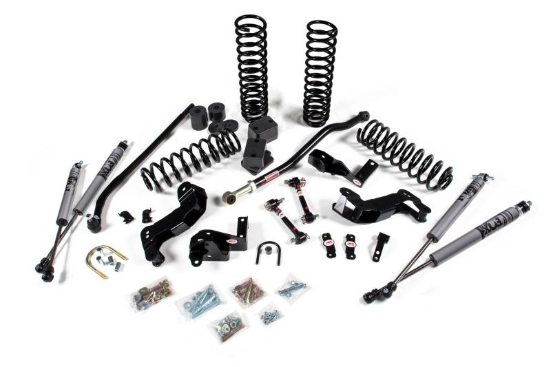 J-Kontrol 3.5" Lift Kit Improve the ground clearance and off road capability of your 4 Door Jeep Wrangler JK with the JKS J-Kontrol 3.5" suspension system. The J-Kontrol system retains your OE control arms, but steps up the rest of your suspension. J-Kontrol kits feature dual rate coil springs, adjustable front track bar, specially-valved gas shocks, sway bar Quicker Disconnects, and front control arm correction brackets as well as all other necessary hardware for a complete bolt-on installation. J-Kontrol system's front control arm correction brackets further enhance the on-road handling by flattening out the control arm to more closely mimic factory angles while correcting caster. With a matched combination of parts, J-Kontrol systems offer very solid performance without compromising daily-driver comfort. If you spend a good amount of time on the trails, take control with J-Kontrol. Front/Rear Dual Rate Coil Springs designed for great ride quality and improved performance across any terrain Front/Rear JSPEC Gas Shocks specifically valved for this suspension system for improved performance on and off-road Front Adjustable Track Bar and Rear Track Bar Bracket to correct axle positioning under vehicle Front Sway Bar Quicker Disconnects and Brake Line Brackets to allow for increased offroad articulation Front Control Arm Relocation Brackets to improve suspension geometry for improved handling