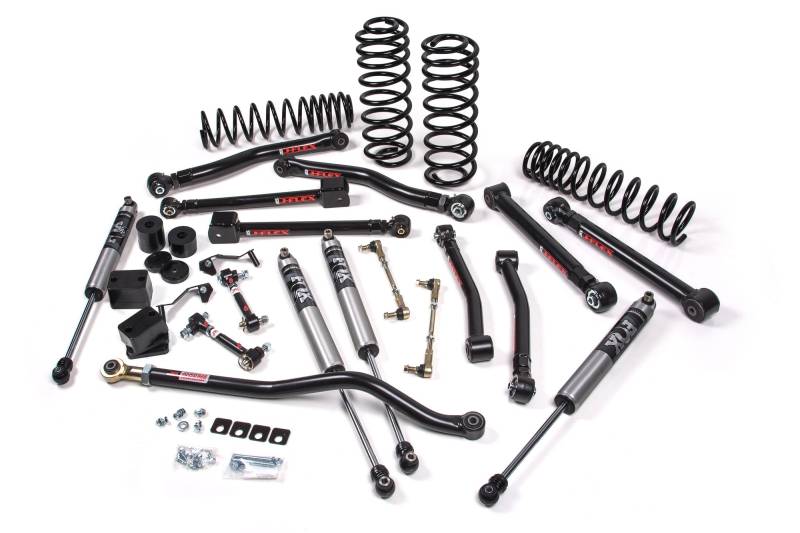 J-Krawl 3" Lift Kit From hardcore rock crawling to high-speed desert, the J-Krawl System brings a level of performance and adjustability that makes it the go to package for many Jeep enthusiasts. These systems build on the base systems and add comments for a full overhaul of the factory suspension to maximum articulation, strength and allow for adjustability. Components include J-Flex upper and lower control arms, Jspec dual rate coil springs, an adjustable front track bar, a rear track bar bracket, quicker disconnect front sway bar end links, and bump stop extensions. This particular kit features next level performance from the FOX 2.5 Performance Elite Series shocks with DSC adjustment to deliver next level performance with easy adjustment to dial in high-speed/low-speed compression damping for improved performance across off terrains. J-Krawl builds off Jeep’s factory suspension mounting points and upgrades everything front to rear. Adjustability is important for fine tuning suspension geometry. J-Krawl delivers. Dial in front caster, rear pinion and overall vehicle wheelbase. Take your Jeep's off-road performance and strength to the next level. It should be noted that an aftermarket front driveshaft is strongly recommended due to potential additional travel. Front/Rear HD Dual Rate Coil Springs designed for great ride quality across any terrain HD springs offer additional load capacity for vehicles equipped with winch bumper, fullsize spare, roof rack, etc. Front/Rear FOX 2.5 Performance Elite Series Shocks specifically valved for this suspension system for improved performance on and off-road Front Adjustable Track Bar and Rear Track Bar Bracket to correct axle positioning under vehicle Front Sway Bar Quicker Disconnects and Rear Sway Bar Links for increased off-road articulation