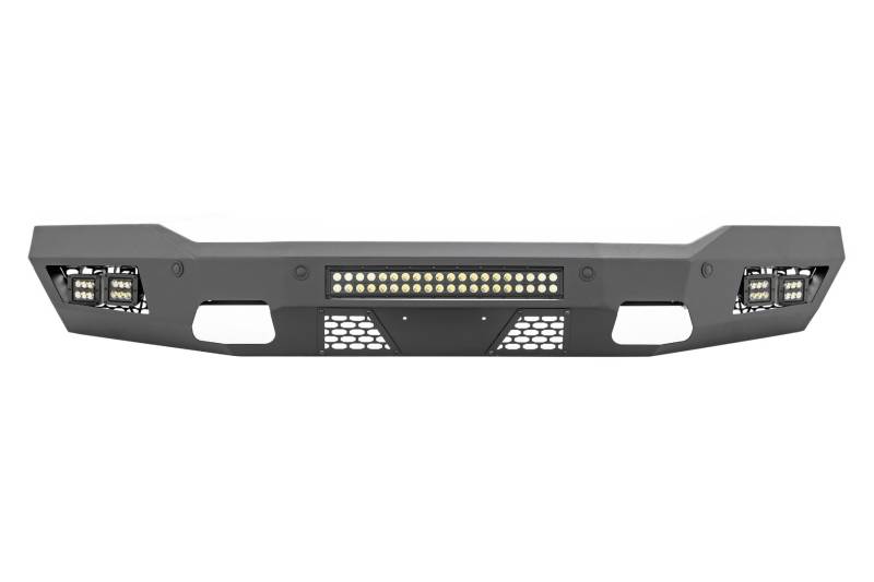 - Easy to install!\ Slim, Sleek design that follows factory features.\ Durable, steel construction.\ Integrated Skid Plate.\ Includes (4) Rough Country LED Cubes.\ Includes 20in Dual Row Rough Country LED Light Bar.\ Retains factory tow hooks.\ Retains factory proximity sensors.\ .