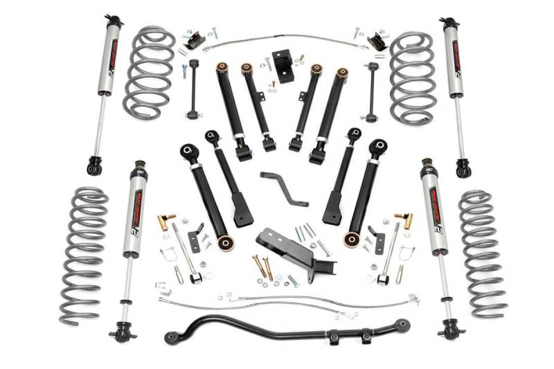 Total Transformation, On and Off the Trail: Give your Jeep TJ the ultimate upgrade with Rough Country's 4in X-Series Suspension Lift Kit. This all-inclusive package delivers everything you need for aggressive styling, increased ground clearance, and enhanced off-road capability.Precision Adjustable Control Arms: This kit includes front and rear upper and lower X-Flex Control Arms featuring a high-clearance design. Built with OEM-style rubber bushings, fully rebuildable flex joints, and massive 2.5" diameter bodies with 1.25" threads, these control arms are fully greasable for long-lasting durability and superior articulation. Fine-tune your ride height and suspension geometry with ease.Optimized Suspension Geometry: Lifted coil springs provide the perfect combination of ride height and vibration dampening, delivering optimal suspension performance across any terrain. This kit also includes durable stainless steel brake lines for improved reliability and safety.Heavy-Duty Forged Adjustable Track Bar: When it comes to strength and stability, the forged solid steel Adjustable Front Track Bar delivers. Weighing a robust 16 pounds, this track bar outmatches stock components, ensuring precise axle alignment and control even during extreme off-road flexing. it's fully adjustable on the vehicle and easy to install.Custom Shock Options for Any Terrain: Choose your ideal ride with Rough Country's premium shock upgrades. The included nitrogen-charged N3 shocks offer 10-stage variable valving and a 54mm shock body for faster cooling and up to 36kN tensile strength. For those craving next-level performance, optional V2 performance shocks or M1 monotube shocks are available to match your driving style.Confident, Balanced Stance: This lift kit levels the front of your Jeep with the rear, delivering a commanding, well-balanced look that performs as good as it looks.Peace of Mind Guaranteed: Backed by Rough Country's Limited Lifetime Replacement Warranty, you can hit the trails with confidence knowing your investment is protected.