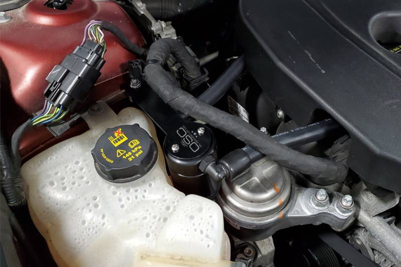 Oil Separator 3.0 Passenger Side During the process of venting crankcase pressure back through your intake track, large amounts of oil, in the form of vapors can gather/accumulate in your intake tube, intake manifold runners and even dilute your gas, lowering its octane level. This happens on all engines and is even worse with forced inducted vehicles (supercharged and turbocharged) as crankcase pressures are increased. To combat this, we have developed an oil separator of our own design. Milled from solid billet aluminum this is a rock-solid piece. It has a knurled tank base for easy removal to drain the spent oil and an O-ring seal to prevent any leaks.