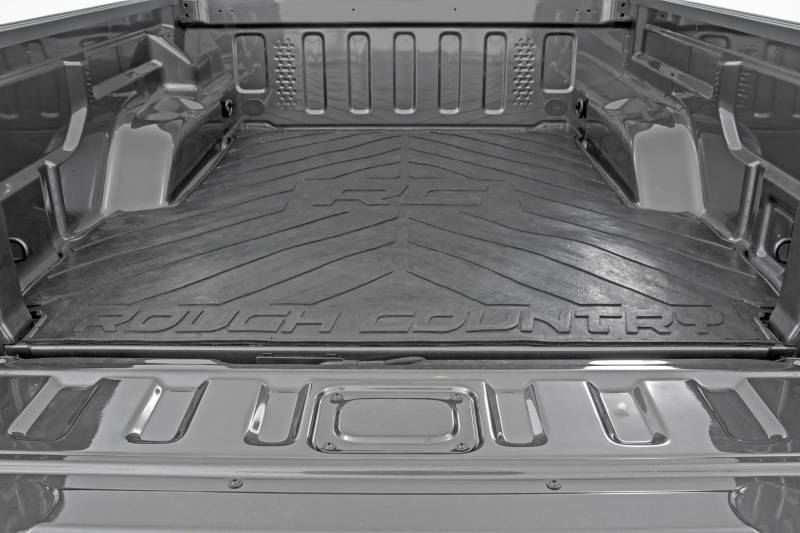 Innovative Design and Material. Keep your bed free from scuffs, scrapes, and scratches with Rough Country Bed Mats. These heavy-duty, 3/8-inch thick, contoured rubber mats are nearly indestructible; made from a high-quality rubber compound that won’t crack in extreme temperatures or fade when exposed to the sun. This stylized bed mat features a large "RC" and "Rough Country" logo with angled lines for an improved look that also protects your truck bed.\ Installation. With a simple drop-in design, installation couldn't be easier. With an estimated timeframe of 10 minutes, this mat can be installed at home efficiently and quickly! Simply place the bed mat in, and roll it out and you're done!\ Limited Lifetime Replacement Warranty. Rough Country's bed mats are backed with a limited lifetime replacement warranty towards manufacturer defects. As such, the product is protected from structural and workmanship damage after the date of purchase. With our industry-leading warranty give yourself peace of mind when using Rough Country products!