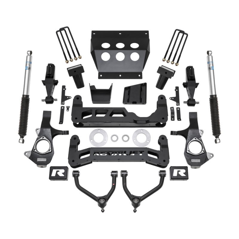 ReadyLIFT is excited to introduce a 7-inch big lift kit designed for 2014-2018 Chevy Silverado and GMC Sierra 1500 trucks, compatible with or without MagneRide. The 44-3472 lift kit is tailored for use on 2014-UP GM 1500 trucks with factory Stamped Steel front suspension, featuring new tubular upper control arms. Key features of this kit include retaining the factory turning radius while minimizing track width increase to less than 0.5" per side, accommodating up to a 35" tall tire on a 9-inch wide wheel with -12 offset. The kit utilizes a "clam-shell" style lower strut extension that doesn't require strut rotation and maintains the factory ride using TCT lower bushings. Additionally, proprietary tubular upper control arms enhance upper control arm strength compared to OE stamped steel arms. The lift kit includes boxed steel front/rear cross members and a full-width front skid plate, allowing the use of the OE front plastic gravel guard for engine bay protection. The 1/4-inch boxed plate steel differential drop brackets feature a double gusset and boxed center rib to handle front differential torsional twisting (not for AWD applications - 2WD or 4WD only). The rear lift is achieved with fabricated 3/16-inch thick plate steel rear lift blocks, including built-in bump stop landings and an offset pin design to center the axle properly. Premium extended length Bilstein rear shocks are included. Note: Fits up to a 35" tall off-road tire, requires a 9-inch wide wheel with -12 offset for no rub (tire tread varies, some aggressive tires may require minor trimming). Not suitable for AWD applications, and not recommended for GMC Denali 1500 with REAR MagneRide or other models with Rear MagneRide (Front MagneRide is okay). It can be used on trucks with factory Aluminum front suspension and includes the ReadyLIFT ReadyGuard Powertrain Warranty.