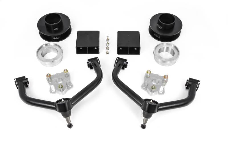 ReadyLIFT offers a mild lift solution to properly enhance the stance and driving quality of the 2019-2023 Ram 1500 truck 2WD/4WD. Like the body design, the suspension design of the 2019-2023 Ram 1500 features some unique design elements that differ from the previous generation Ram. These differences were tackled by our engineers as a result, we now offer a new SST lift kit exclusively for the new Ram 1500 2WD/4WD trucks. The 69-1935 SST lift kit provides 3.5" of front lift and 2" of rear lift. The new body style Ram now comes with a composite upper control arm with a sheet metal cover. Our engineers determined the the best kit solution would be to include our DOM tube steel upper control arms with corrected ball joint angles. The lift is delivered by way of CNC-machined billet aluminum top mount strut extensions and spring pre-load spacers. This combination generates a true 3.5" of front lift which is perfect for installing up to a 35" tall tire on a 20x9 inch wheel with a 0 offset. This lift works great without exceeding the CV limits which works well within the OEM tolerances. The 2019-2022 has a new rear set up which requires an all-new fabricated steel rear coil spring spacer. This spacer provides 2 inches of rear lift and also includes rear bump stop extensions to control compression. Our 69-1935 3.5" SST Lift Kit will get the job done right and affordably. Not for use on factory air suspension equipped trucks. Note: NOT intended for off-road use or abuse. Note: If running a 35x12.50-20, the minimum wheel offset is 0 offset on a 9" wide wheel. If running a 295/65-20 the minimum is a +18 offset to ensure the tire does not rub the control arm at full turn.