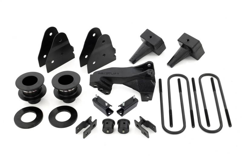 ReadyLIFT Suspension has engineered a 3.5" lift kit made to fit the 2017-2022 Ford F250/F350 SuperDuty 4WD trucks with a one-piece drive shaft. This 3.5" lift kits allow for wheel and tire combinations up to 37" while keeping the smooth OEM ride and drivability. This is a complete lift kit includes 4" OEM-equivalent rear blocks with integrated bump stop landings, 3.5" coil spring extensions with sound isolators, an OEM-style panhard drop bracket, front bump stops OEM shock extension brackets, a pair of radius arm drop brackets, and all needed hardware. When used with the maximum size tires, the F250 truck body is raised over 6". ReadyLIFT Smart Suspension Technology is used to make this kit very user-friendly to install, requiring no cutting or drilling. Like all other ReadyLIFT kits, the F250/F350 3.5" SST Lift Kit is guaranteed for life against manufacturing defects. Popular wheel and tire sizes used for this vehicle include the stock rims (17x8, 6.5" backspacing) with 37x12.5 tires, 20x9.5 rims (+25" backspacing) with 37x12.5 tires, and 22x9.5 rims (+25 backspacing) with 37x12.5. NOTE: For use with trucks with a one-piece drive shaft. NOTE: Single Rear Wheel Trucks ONLY -- Not compatible with Dual Rear Wheels NOTE: The lift blocks in this kit are not designed to work with aftermarket or factory add-on air spring/load leveling kits that attach to the bump stop tangs. Use of this type of air bag system will void all block warranties and can cause failure of the block bump stop tang. NOTE: 2020-2022 Super Duty may sit slightly taller in the rear than prior model years due block height variations from the Ford factory. The additional rake works well visually with the vehicle's body lines. NOTE: Not compatible with TREMOR editions.