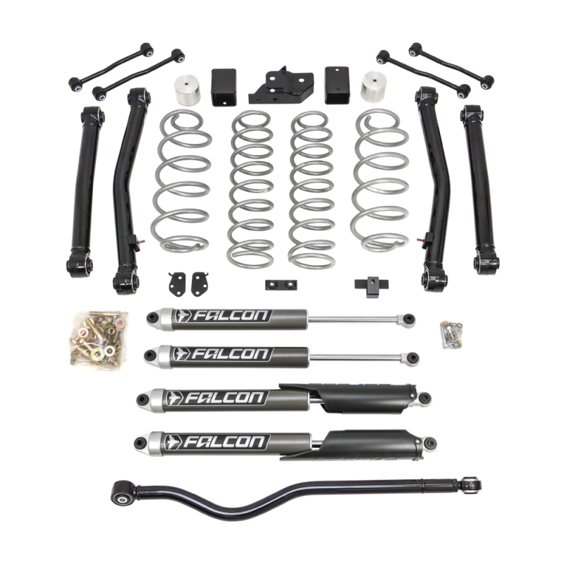 The ReadyLIFT Terrain Flex 4-arm Coil Spring Lift Kit with (4) heavy-duty control arms is the premiere choice for the Jeep JL Wrangler owner who demands an incredibly high-quality ride on road, while maximizing off road and rock-crawling mannerisms. The 69-6837 kit includes the best of everything and includes 4 front heavy-duty DOM tube steel front control arms. Each control arm is fitted with our proprietary Terrain Control Technology (TCT) bushings in forged housings. TCT bushings provide greater articulation and range of motion so they are far superior to the factory bonded bushings that resist suspension flex. These new heavy-duty arms provide increased ground clearance and improve caster geometry for a great ride on the road. Four linear rate coil springs provide 3.5" of lift mated with bump stop extensions to control compression and tire contact during suspension articulation. A new rear track bar relocation bracket and our new JL-specific heavy-duty adjustable front track bar ensure your lifted Jeep JL will drive and handle amazing! And of course the icing on this exceptional new JL suspension offering is the inclusion of Falcon's Series 2.1 monotube performance shocks for all four corners. These fixed-rate, purpose-built, custom-tuned shocks are engineered to deliver increased stability, improved ride quality, and comfort for daily driven Jeeps. You'll be shocked at how good your JL will ride and drive on the street and on the trail! NOTE: This kit is not compatible with Wrangler or Gladiator optional powertrains including, but not limited to, the 3.0L Diesel, Rubicon 392, and 4xe editions.