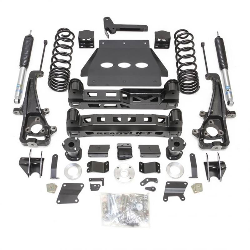ReadyLIFT is proud to announce that our long-awaited 6 inch lift kit for the 5th gen 2019-2023 Ram 1500 trucks is now available! After dedicated development and long-term testing, we are now shipping our Ram 1500 Big Lift Kit for the Ram customer seeking unmatched performance, style and durability. The all-new 44-1960 6" lift kit is a great option for 5th gen Ram 1500 owners who want a great riding tall stance capable of accepting 37" tall tires. Our engineers are delighted with the development of this kit and its many great features that make it the best 6" lift kit on the market! The 44-1960 lift kit includes many great features like rear Bilstein 5100 shocks, dual rate rear coil springs and rear control arm brackets which combine to better capture small bump sensitivity and mid-stroke support. Laser cut heavy-duty steel front cross members and differential drops retains factory geometry while providing proper differential rotation to ensure there is no drive line vibration when in 4WD or Auto-4HI. This Ram 1500 6" lift kit adopts all the important elements of a premium lift kit to ensure the truck rides and drives remarkably. Rear track bar bracket, Bilstein rear shocks, longer rear sway bar end links, heavy-duty cast iron knuckles, and even new thick steel skid plates are just a few of the ingredients contributing to an amazing driving experience on up to 37x12.50 tall tires on 9" wide wheels with 0 offset. (See tire details below).\nNote: RAM 1500 with factory 22" wheels requires a larger bore knuckle assembly due to larger wheel bearing assembly. Vehicles with 22-inch factory wheels should use #44-1961 coming soon or install replacement standard wheel bearing assemblies (not included). If installing this kit on any Off Road Group Package equipped truck, ReadyLIFT recommends foregoing the front preload spacer installation - the lifted vehicle will sit about 1/2" front high with the preload spacer installed or 3/8" low without the preload spacer. This kit is NOT compatible with (1) adjustable "air ride" suspension-equipped models or (2) Ram TRX.