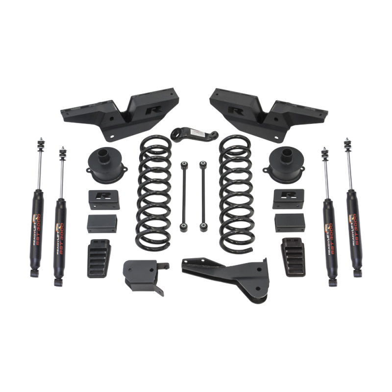ReadyLIFT 6'' Lift Kit fits 2014-2018 Dodge Ram 2500 4WD Series diesel short bed trucks. ReadyLIFT Suspension This exciting lift system is Made in the U.S.A. and provides 6'' of front lift and features the best engineering technology you will find on the market today. The 49-1600 series 6" system utilizes performance front coil springs providing a true 6'' of front lift. In the rear, we use our proven spacer design technology to design heavy-duty 3.5" lift rear spacers which team up perfectly with the factory rear coil springs. This system includes a lift structure that will enhance and improve the overall factory ride while greatly improving off-road performance. Along with performance springs and spacers, our engineering team also developed rugged frame-mount radius arm drop brackets that reposition the factory radius arms back to the factory position. This is important so that the OEM alignment geometry can be retained. We also include heavy-duty fabricated steel front and rear track bar brackets, dropped cast iron front pitman arm, and front sway bar relocation brackets. We even include front/rear bump stop extensions to prevent over-compression during off-road use. Kit includes four (4) SST3000 Shocks. This new 6-Inch performance suspension system is designed specifically for the 2014-2018 Dodge Ram 2500 4WD trucks with diesel engines and will allow for increased tire packages up to 37x13.50 and 9.5" wide wheel sizes from 17-20" diameters.