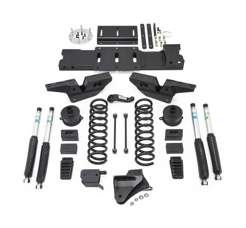 The new Ram HD trucks are more popular than ever and our ReadyLIFT 6" lift kit we introduced two years ago has been an extremely popular lift option. How can we take an already great 2019-2023 Ram HD 6" lift kit and make it better? How about adding a new CNC-machined billet Aluminum transfer case clocking ring to reposition the transfer case pinion angle? Some Ram HD trucks can experience a slight vibration after lifting due to driveline angle sensitivity. Our new 49-1961 6" lift kit addresses that inherent driveline system issue with the addition of a heavy-duty transfer case clocking [indexing] ring and new transmission crossmember. This Driveline Indexing System (DIS) combination works great with our ReadyLIFT 6" lift kit while re-positioning the transmission and pinion position for a smooth driving experience on or off road. Kit 49-1961 includes everything in our popular 49-1960 6" lift kit as well as these new DIS re-positioning components. Heavy duty and great riding 6" lift front springs, 3.5" lift rear coil spring spacers, heavy-duty radius arm drop brackets, heavy-duty fabricated steel front and rear track bar brackets, dropped cast iron pitman arm, front/rear sway bar relocation brackets and bump stop extensions preventing over- compression of the new Bilstein 5100 series front/rear shocks are all included in this premium kit. For use on diesel 2500 trucks only.