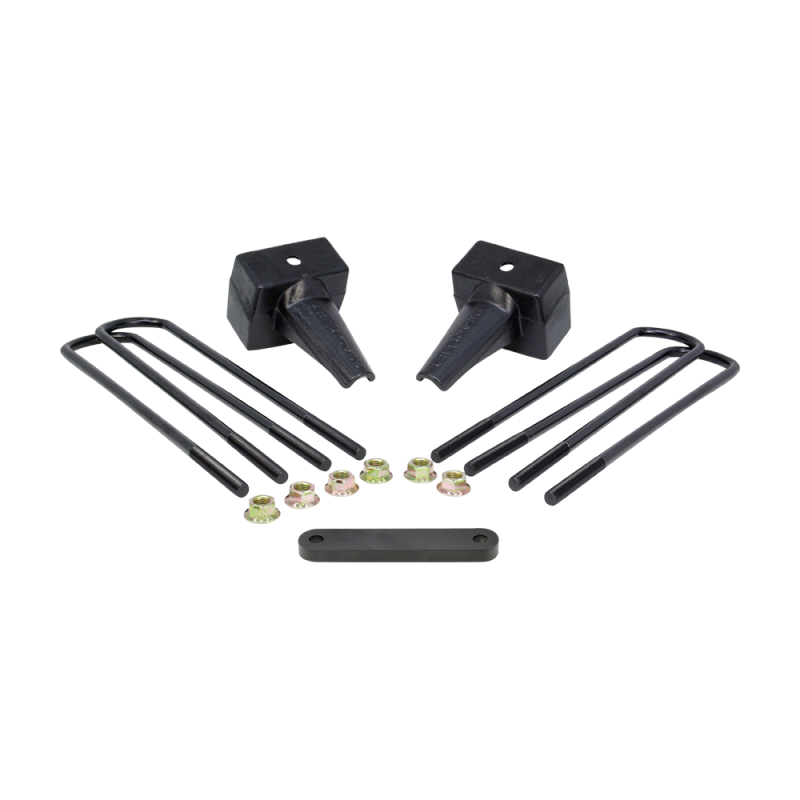 ReadyLIFT OEM-style rear block kits are available for model specific applications. These Rear Block Kits include two (2) 5" Rear Blocks, four (4) E-Coated U-Bolts, eight (8) Nuts and Washers and will safely lift the rear of your 1999-2010 Ford Super Duty 2WD/4WD Truck with a two-piece driveshaft. Based on OEM designs and never made out of light weight extrusions our 66-2295 5.0" Ford Super Duty Blocks have Integrated OEM Style Bump Stops. ReadyLIFT Block Kits will put a slight rake back in your truck for hauling or towing and are designed to work in concert with your ReadyLIFT Suspension Leveling Kit. In fact, these blocks are the ideal Tow Package upgrade for not only for stock height vehicles but lifted or leveled trucks too! Like all ReadyLIFT products, these block kits come with our Limited Lifetime Warranty. NOTE: The lift blocks in this kit are not designed to work with aftermarket or factory add-on air spring/load leveling kits that attach to the bump stop tangs. Use of this type of air bag system will void all block warranties and can cause failure of the block bump stop tang.