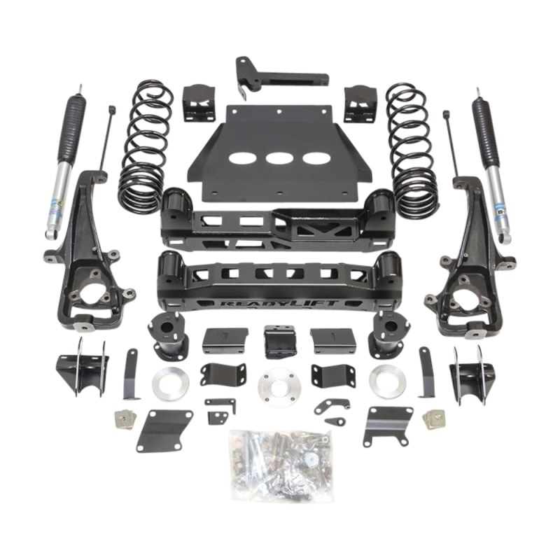 ReadyLIFT offers a 6 inch lift kit for 5th gen 2019-2023 Ram 1500 trucks that came factory with 22 inch wheels! After dedicated development and long-term testing, we are now shipping our Ram 1500 Big Lift Kit for the Ram customer seeking unmatched performance, style and durability. The all-new 44-1961 6" lift kit is a great option for 5th gen Ram 1500 owners who want a great riding tall stance capable of accepting 37" tall tires. Our engineers are delighted with the development of this kit and its many great features that make it the best 6" lift kit on the market! The 44-1961 lift kit includes many great features like rear Bilstein 5100 shocks, dual-rate rear coil springs and rear control arm brackets which combine to better capture small bump sensitivity and mid-stroke support. Laser-cut heavy-duty steel front cross members and differential drops retain factory geometry while providing proper differential rotation to ensure there is no driveline vibration when in 4WD or Auto-4HI. This all-new Ram 1500 6" lift kit adopts all the important elements of a premium lift kit to ensure the truck rides and drives remarkably. Rear track bar bracket, Bilstein rear shocks, longer rear sway bar end links, heavy-duty cast iron knuckles, and even new thick steel skid plates are just a few of the ingredients contributing to an amazing driving experience on up to 37x12.50 tall tires on 9" wide wheels with 0 offset. (See tire details below).\nNote: This kit is for the RAM 1500 with factory 22" wheels and no air ride. Kit requires a larger bore knuckle assembly due to larger wheel bearing assembly. If installing this kit any Off-Road Group Package equipped truck, ReadyLIFT recommends foregoing the front preload spacer installation - the lifted vehicle will sit about 1/2" front high with the preload spacer installed or 3/8" low without the preload spacer. This kit is NOT compatible with (1) adjustable "air ride" suspension equipped models, (2) diesel engine applications, or (3) Ram TRX.