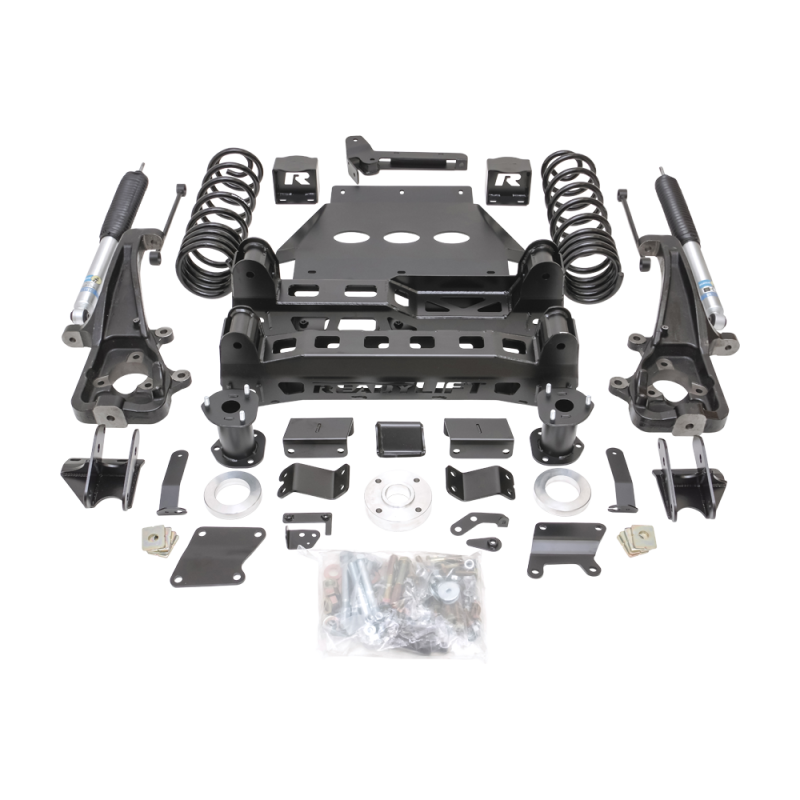ReadyLIFT now offers a 6 inch lift kit for 2019-2023 Ram 1500 Air Ride trucks that came factory with 22 inch wheels for the 5th gen is now available! After dedicated development and long-term testing, we are now shipping our Ram 1500 Big Lift Kit for the Ram customer seeking unmatched performance, style and durability. The all-new 44-19622 6" lift kit is a great option for 5th gen Ram 1500 owners who want a great riding tall stance capable of accepting 37" tall tires. Our engineers are delighted with the development of this kit and its many great features that make it the best 6" lift kit on the market! The 44-19622 lift kit includes many great features like rear Bilstein 5100 shocks and rear control arm brackets which combine to better capture small bump sensitivity and mid-stroke support. Laser-cut heavy-duty steel front cross members and differential drops retain factory geometry while providing proper differential rotation to ensure there is no driveline vibration when in 4WD or Auto-4HI. This all-new Ram 1500 6" lift kit adopts all the important elements of a premium lift kit to ensure the truck rides and drives remarkably. Rear track bar bracket, Bilstein rear shocks, longer rear sway bar end links, heavy-duty cast iron knuckles, and even new thick steel skid plates are just a few of the ingredients contributing to an amazing driving experience on up to 37x12.50 tall tires on 9" wide wheels with 0 offset. (See tire details below). Note: This kit is for the RAM 1500 that came factory with 22" wheels with air ride. Kit requires a larger bore knuckle assembly due to larger wheel bearing assembly.