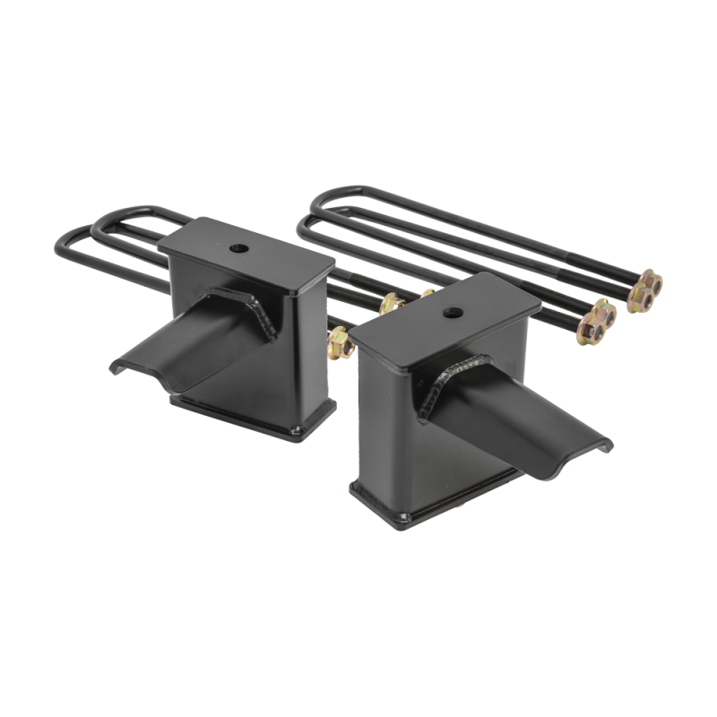 ReadyLIFT OEM-style rear block kits are now available for 2017-2023 Ford Super Duty model-specific applications. These 6.0" fabricated steel Tapered Rear Block Kits include two (2) rear blocks, four (4) long e-coated u-bolts and eight (8) nuts and washers. Based on OEM designs and never made out of lightweight extrusions, our 6" 2017-2023 Ford Super Duty Tapered Rear Blocks have Integrated OEM style bump stops. ReadyLIFT Block Kits will put a slight rake back in your truck for hauling or towing and are designed to work with your ReadyLIFT Suspension Leveling Kit In fact, these blocks are the ideal Tow Package upgrade for not only for stock height vehicles but lifted or leveled trucks too! Like all ReadyLIFT products these block kits come with our Limited Lifetime Warranty. NOTE: 66-2760 6" block is for use on 2017-2023 Ford F250 Super Duty 4WD trucks with 1-piece drive shaft. Lift height will vary depending on what factory block your truck has. NOTE: Not for use on 2019-UP F350. NOTE: The lift blocks in this kit are not designed to work with aftermarket or factory add-on air spring/load leveling kits that attach to the bump stop tangs. Use of this type of air bag system will void all block warranties and can cause failure of the block bump stop tang.
