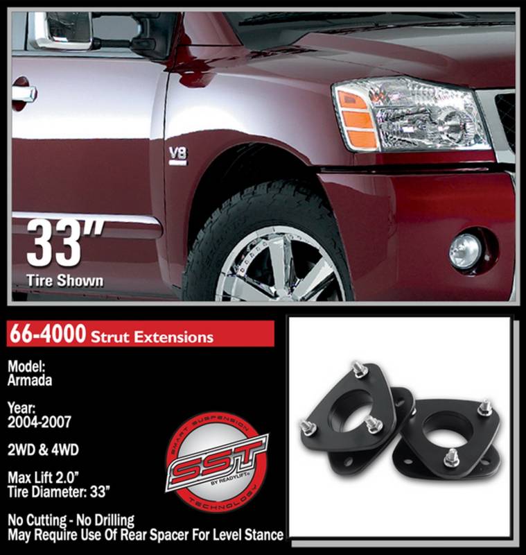 ReadyLIFT leveling kits are the fastest, safest, least expensive way to bring the front of your vehicle level with the rear. Our innovative Smart Strut Technology mounts on top of the strut assembly, eliminating the hassle, time and danger of compressing springs. ReadyLIFT steel strut extension will maintain a smooth OEM ride without adding pressure to stock suspension components, guaranteed! The 66-4000 strut extension provides 2" of lift which gives clearance to add up to 33" wheels and tires to the 2004-2007 Nissan Titan, Nissan Armada, and Infiniti QX56. For information about tire and wheel sizes please visit the ReadyLIFT.