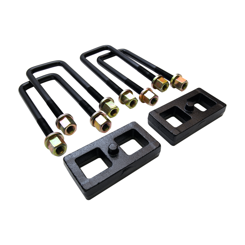 ReadyLIFT OEM-style rear block kits are available for 1995-2023 Tacoma six-lug model and 1999-2021 Tundra applications. These Rear Block Kits include two (2) 1" Rear Blocks, four (4) E-Coated U-Bolts, eight (8) Nuts and Washers and will safely lift the rear of your truck an additional 1". Based on OEM designs and made from cast iron (never made out of light weight extrusions), ReadyLIFT Block Kits will put a slight rake back in your truck for hauling or towing and are designed to work in concert with your ReadyLIFT Suspension Leveling Kit. This is a great Tow Package upgrade. Like all ReadyLIFT products, these block kits come with our Lifetime Warranty.