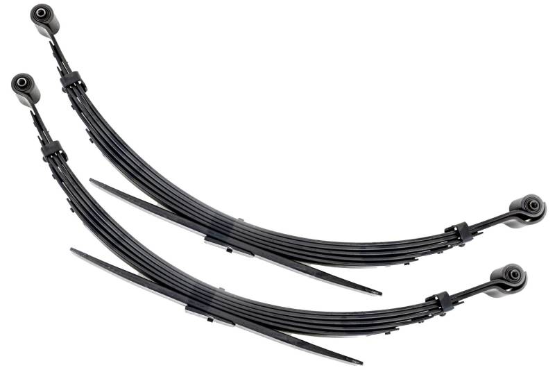 Added Lift Height and Ride Comfort. Take your suspension kit to the next level with Rough Country's Replacement Leaf Springs. Constructed from high-quality materials and designed specifically for the weight of your vehicle. This enhanced replacement spring will provide a factory-like feel while retaining your suspension lift height. \ Durable and Off-Road Ready. Rough Country's Replacement Leaf Springs are designed to tackle any terrain that they are faced with. Featuring a multi-leaf design and spring pads this reduces the friction and maximizes comfort. Each leaf pack utilizes tapered leaves for improved flexibility at their ends. \ Installation. Rough Country's Replacement Leaf Springs offer a 100% bolt-on installation estimated to take approximately 1-2 hours depending on vehicle condition. Simply remove the pre-existing leaf spring and use the stock hardware to equip your vehicle with this high-quality replacement. \ Lifetime Replacement Warranty. Rough Country's Replacement Leaf is backed with a 5-year replacement warranty towards manufacturer defects. As such, the product is protected from structural and workmanship damage after the date of purchase. With our industry-leading warranty give yourself peace of mind when using Rough Country's Suspension products!