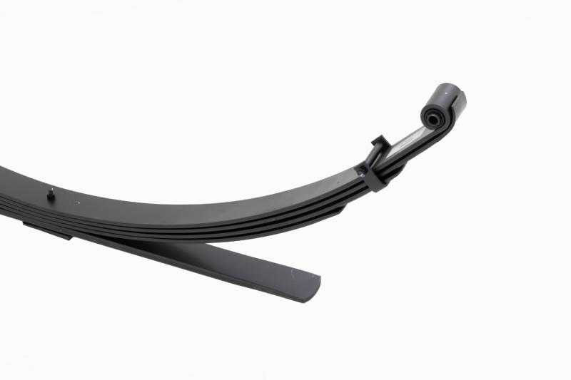 Added Lift Height and Ride Comfort. Take your suspension kit to the next level with Rough Country's Replacement Leaf Springs. Constructed from high-quality materials and designed specifically for the weight of your vehicle. This enhanced replacement spring will provide a factory-like feel while retaining your suspension lift height. \ Durable and Off-Road Ready. Rough Country's Replacement Leaf Springs are designed to tackle any terrain that they are faced with. Featuring a multi-leaf design and spring pads this reduces the friction and maximizes comfort. Each leaf pack utilizes tapered leaves for improved flexibility at their ends. \ Installation. Rough Country's Replacement Leaf Springs offer a 100% bolt-on installation estimated to take approximately 1-2 hours depending on vehicle condition. Simply remove the pre-existing leaf spring and use the stock hardware to equip your vehicle with this high-quality replacement. \ Lifetime Replacement Warranty. Rough Country's Replacement Leaf is backed with a 5-year replacement warranty towards manufacturer defects. As such, the product is protected from structural and workmanship damage after the date of purchase. With our industry-leading warranty give yourself peace of mind when using Rough Country's Suspension products!