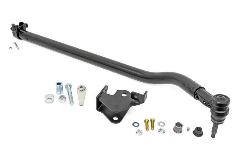 Superior Handling and Performance. Give your steering setup incredible durability and improve your suspension geometry with Rough Country's High Steer Kit for Jeep JL/JT models. At stock height, your vehicle's drag link and track bar sit parallel. The more you lift your Jeep, the further your track bar and drag link drift apart. This differentiation can cause bump steer during suspension travel. Rough Country's JL/JT High Steer Kit resets these two components back to an optimum, factory-like angle. \ Durable Construction and Design. Rough Country's JK High Steer Kit features a massive 1.5in DOM tube design and fully greaseable tie rod end that's considerably larger than stock and ready to tackle any terrain. Featuring a high sweeping angle and optional track bar bracket, this solution promotes better handling and steering without adding additional stress to your steering box. \ Installation. Featuring a 100% bolt-on installation an estimated timeframe of 2-3 hours is predicted to complete the installation process. This full kit can be installed can be completed efficiently and quickly!\ Limited Lifetime Replacement Warranty. Rough Country's High Steer Kit is backed with a limited lifetime replacement warranty towards manufacturer defects. As such, the product is protected from structural and workmanship damage after the date of purchase. With our industry-leading warranty give yourself peace of mind when using Rough Country's Suspension products!