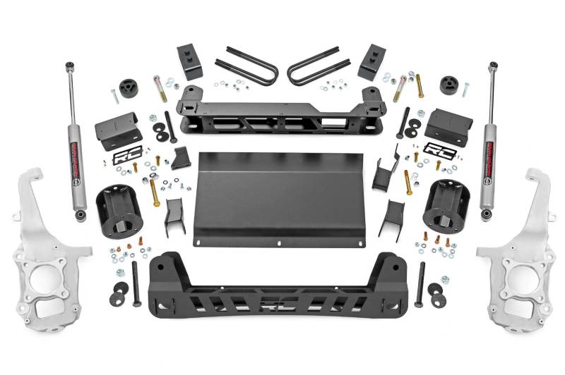 It's time to take your Ford F-150 Tremor up a notch! Give your Tremor aggressive good looks and superior ride quality with Rough Country’s 4 Inch Lift Kit. This kit will provide increased ground clearance and levels the front with the rear of your ride. So, whether you're hitting the trails or just cruising around town, this lift kit will have you covered.\ Heavy-duty and reliable. Rough Country's 4in Lift Kit for the Ford F-150 Tremor is engineered with high-quality heavy-duty steel components. Featuring a set of durable lifted knuckles and strut spacers, you'll gain enough ride height to run up to 35-inch tires with proper wheel spacing! A 1/4-inch thick plate steel front and rear cross member bring uncompromised strength and good looks to your truck. Our fabricated blocks are stronger and offer a longer lifespan than cast blocks, and track width remains the same as factory. So, you can be sure your truck will look good - and perform even better.\ Installation. Featuring a 100% bolt-on installation process for an easy, no-fuss assembly. With an estimated install time of 8-10 hours, this kit can be installed at home using standard tools.\ Limited Lifetime Replacement Warranty. Rough Country's 4" Lift Kit is backed with a limited lifetime replacement warranty towards manufacturer defects. As such, the product is protected from structural and workmanship damage after the date of purchase. With our industry-leading warranty give yourself peace of mind when using Rough Country's Suspension products!