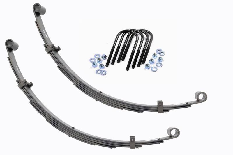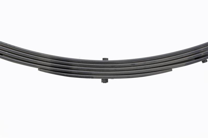 Added Lift Height and Ride Comfort. Take your suspension kit to the next level with Rough Country's Replacement Leaf Springs. Constructed from high-quality materials and designed specifically for the weight of your vehicle. This enhanced replacement spring will provide a factory-like feel while retaining your suspension lift height. \ Durable and Off-Road Ready. Rough Country's Replacement Leaf Springs are designed to tackle any terrain that they are faced with. Featuring a multi-leaf design and spring pads this reduces the friction and maximizes comfort. Each leaf pack utilizes tapered leaves for improved flexibility at their ends. \ Installation. Rough Country's Replacement Leaf Springs offer a 100% bolt-on installation estimated to take approximately 1-2 hours depending on vehicle condition. Simply remove the pre-existing leaf spring and use the stock hardware to equip your vehicle with this high-quality replacement. \ Lifetime Replacement Warranty. Rough Country's Replacement Leaf is backed with a 5-year replacement warranty towards manufacturer defects. As such, the product is protected from structural and workmanship damage after the date of purchase. With our industry-leading warranty give yourself peace of mind when using Rough Country's Suspension products!