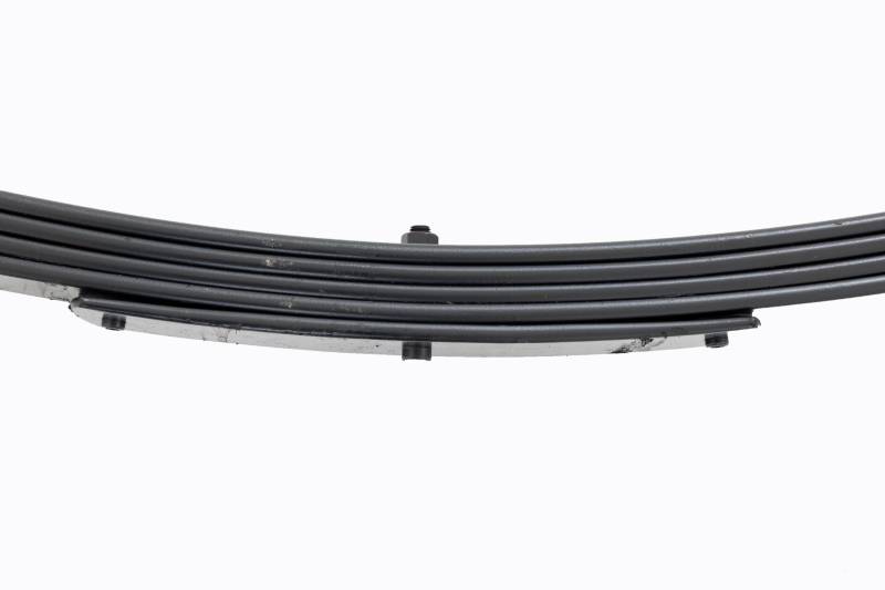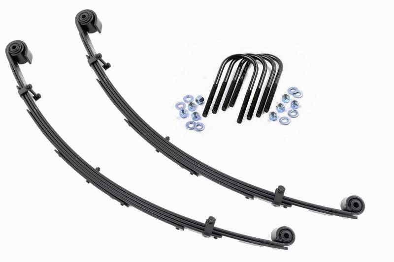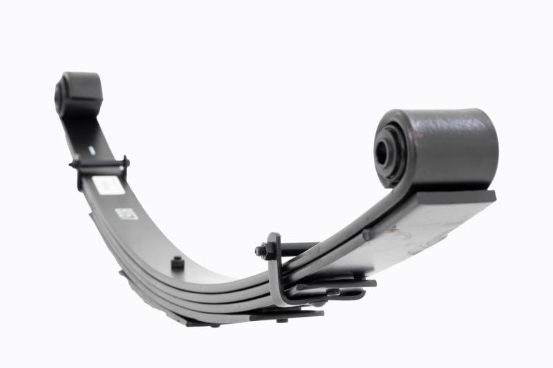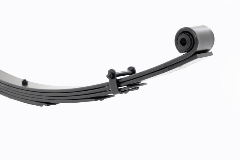 Added Lift Height and Ride Comfort. Take your suspension kit to the next level with Rough Country's Replacement Leaf Springs. Constructed from high-quality materials and designed specifically for the weight of your vehicle. This enhanced replacement spring will provide a factory-like feel while retaining your suspension lift height. \ Durable and Off-Road Ready. Rough Country's Replacement Leaf Springs are designed to tackle any terrain that they are faced with. Featuring a multi-leaf design and spring pads this reduces the friction and maximizes comfort. Each leaf pack utilizes tapered leaves for improved flexibility at their ends. \ Installation. Rough Country's Replacement Leaf Springs offer a 100% bolt-on installation estimated to take approximately 1-2 hours depending on vehicle condition. Simply remove the pre-existing leaf spring and use the stock hardware to equip your vehicle with this high-quality replacement. \ Lifetime Replacement Warranty. Rough Country's Replacement Leaf is backed with a 5-year replacement warranty towards manufacturer defects. As such, the product is protected from structural and workmanship damage after the date of purchase. With our industry-leading warranty give yourself peace of mind when using Rough Country's Suspension products!
