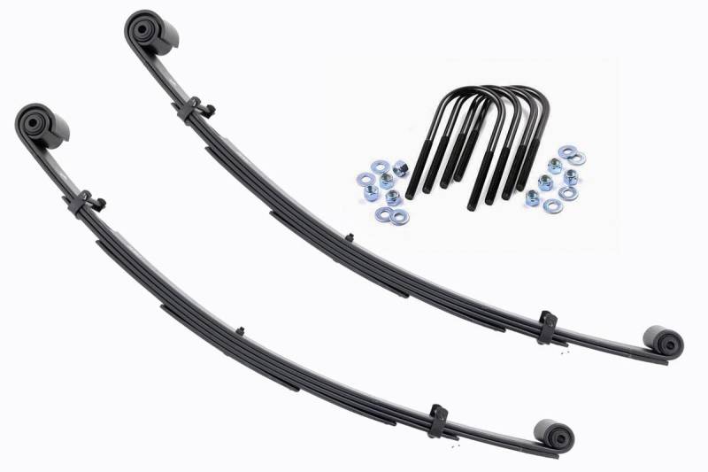 Added Lift Height and Ride Comfort. Take your suspension kit to the next level with Rough Country's Replacement Leaf Springs. Constructed from high-quality materials and designed specifically for the weight of your vehicle. This enhanced replacement spring will provide a factory-like feel while retaining your suspension lift height. \ Durable and Off-Road Ready. Rough Country's Replacement Leaf Springs are designed to tackle any terrain that they are faced with. Featuring a multi-leaf design and spring pads this reduces the friction and maximizes comfort. Each leaf pack utilizes tapered leaves for improved flexibility at their ends. \ Installation. Rough Country's Replacement Leaf Springs offer a 100% bolt-on installation estimated to take approximately 1-2 hours depending on vehicle condition. Simply remove the pre-existing leaf spring and use the stock hardware to equip your vehicle with this high-quality replacement. \ Lifetime Replacement Warranty. Rough Country's Replacement Leaf is backed with a 5-year replacement warranty towards manufacturer defects. As such, the product is protected from structural and workmanship damage after the date of purchase. With our industry-leading warranty give yourself peace of mind when using Rough Country's Suspension products!