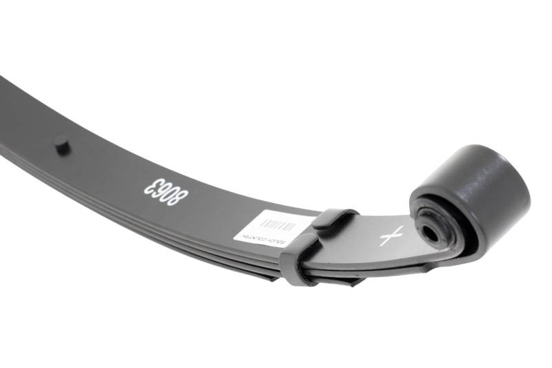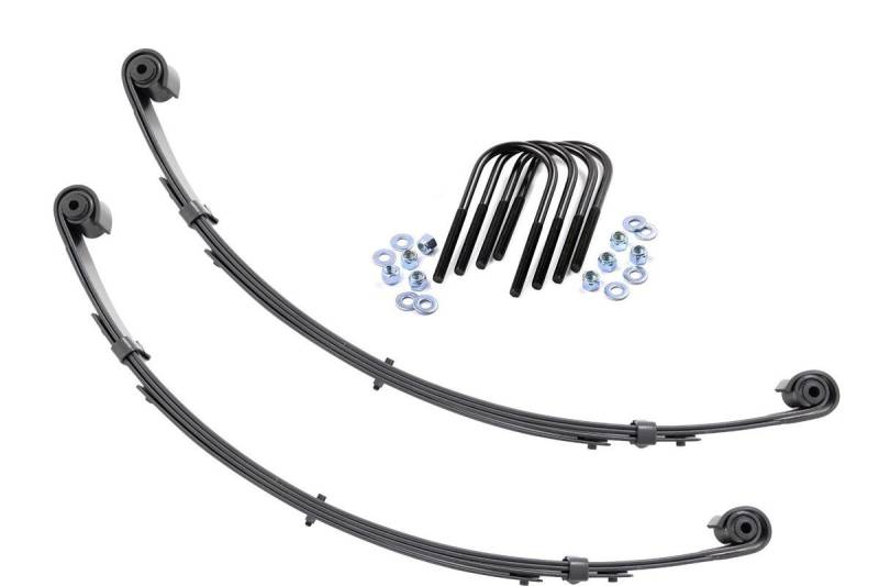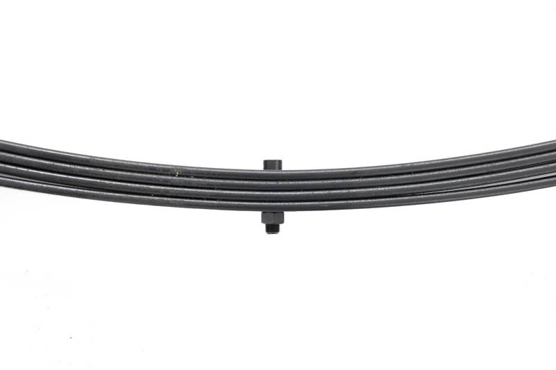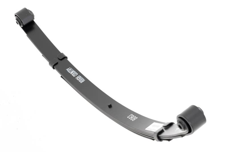 Added Lift Height and Ride Comfort. Take your suspension kit to the next level with Rough Country's Replacement Leaf Springs. Constructed from high-quality materials and designed specifically for the weight of your vehicle. This enhanced replacement spring will provide a factory-like feel while retaining your suspension lift height. \ Durable and Off-Road Ready. Rough Country's Replacement Leaf Springs are designed to tackle any terrain that they are faced with. Featuring a multi-leaf design and spring pads this reduces the friction and maximizes comfort. Each leaf pack utilizes tapered leaves for improved flexibility at their ends. \ Installation. Rough Country's Replacement Leaf Springs offer a 100% bolt-on installation estimated to take approximately 1-2 hours depending on vehicle condition. Simply remove the pre-existing leaf spring and use the stock hardware to equip your vehicle with this high-quality replacement. \ Lifetime Replacement Warranty. Rough Country's Replacement Leaf is backed with a 5-year replacement warranty towards manufacturer defects. As such, the product is protected from structural and workmanship damage after the date of purchase. With our industry-leading warranty give yourself peace of mind when using Rough Country's Suspension products!