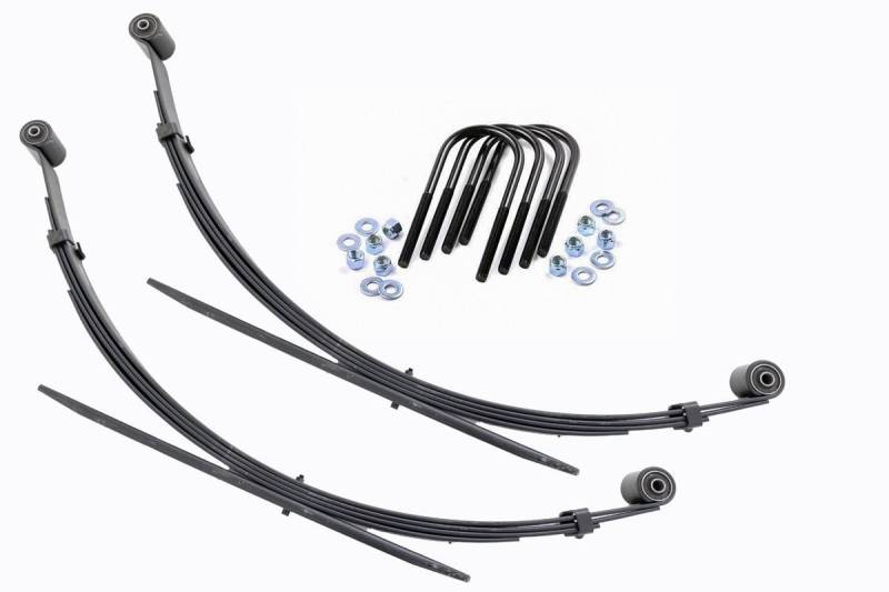 Added Lift Height and Ride Comfort. Take your suspension kit to the next level with Rough Country's Replacement Leaf Springs. Constructed from high-quality materials and designed specifically for the weight of your vehicle. This enhanced replacement spring will provide a factory-like feel while retaining your suspension lift height. \ Durable and Off-Road Ready. Rough Country's Replacement Leaf Springs are designed to tackle any terrain that they are faced with. Featuring a multi-leaf design and spring pads this reduces the friction and maximizes comfort. Each leaf pack utilizes tapered leaves for improved flexibility at their ends. \ Installation. Rough Country's Replacement Leaf Springs offer a 100% bolt-on installation estimated to take approximately 1-2 hours depending on vehicle condition. Simply remove the pre-existing leaf spring and use the stock hardware to equip your vehicle with this high-quality replacement. \ Lifetime Replacement Warranty. Rough Country's Replacement Leaf is backed with a 5-year replacement warranty towards manufacturer defects. As such, the product is protected from structural and workmanship damage after the date of purchase. With our industry-leading warranty give yourself peace of mind when using Rough Country's Suspension products!