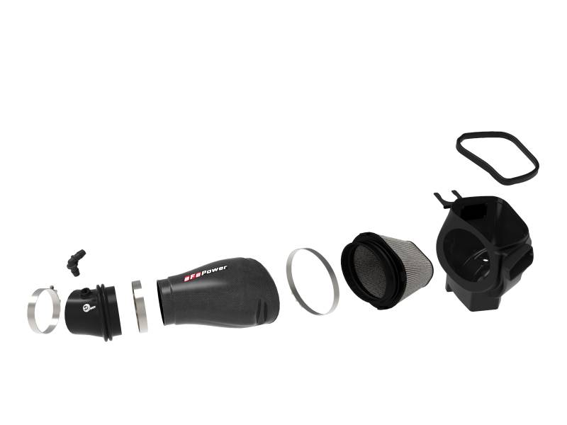 This 7” tall 360-degree radial flow air filter features a 5-1/2" by 7-1/2" flange and our oil-free Pro DRY S media with three layers of synthetic media for maximum convenience. Its progressive layering provides great filtration efficiency and dust holding capacity, while not requiring the use of oils. This media is best suited for street and light off-road use. The included massive air filter is surrounded by an open-element XLPE (cross-linked polyethylene) polymer housing that minimizes warm engine air for maximum performance. Its open design allows for easy viewing of the air filter and delivers an aggressive Air Intake sound. Multiple air inlets bring in cool air when under power without capturing any warm air surrounding the engine. The factory MUA (Multi-Air Unit Actuator) is easily transferred to the aFe POWER housing to guarantee correct crankcase flow, avoiding check engine lights and damaging factory hoses and sensors. All hoses, clamps, and screws are provided to connect to the aFe POWER tube and secure the MUA to the aFe POWER housing. The lightweight tube is computer-designed to achieve maximum power gains while maintaining a perfect fit. Manufactured from 100% twill weave carbon fiber, it features zero fiberglass and is clear-coated for the highest quality construction. This is a direct fit intake system that utilizes factory mounting points. All necessary stainless-steel clamps, silicone coupling, and hardware are included. Its revolutionary design, featuring our patent pending filter-to-housing interface, uses half the number of parts of a traditional cold air intake system. For Dodge Durango SRT Hellcat models, the air filter sits right under the SRT hood vent. aFe Power recommends purchasing 28-10303 pre-filter to protect the air filter from rain and other elements. aFe Power strongly recommends avoiding pressure washing around the hood vent and driving under heavy rain.
