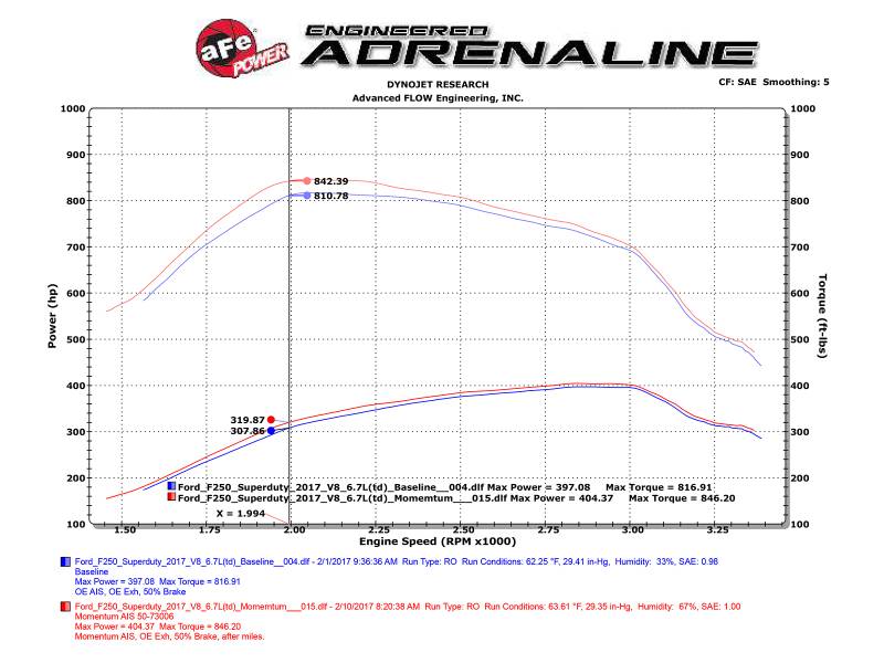 Unique One-Piece High Quality Housing w/ Auxiliary Scoop: The smooth one-piece high quality sealed housing with auxiliary air scoop is used to eliminate the use of multiple-piece housings and ensure the coolest air intake charge available. A large, clear sight window is used for a hassle-free filter inspection and an aggressive style. A urethane plug is also included if you wish to block off the auxiliary air inlet. (US PAT 9440175) For Filter-to-Housing Interface. High Quality Tube: This system uses a high quality, dyno-tuned intake tube to achieve maximum power gains while maintaining a perfect fit. Huge 10-Layer Performance Air Filter: The Momentum HD inta ke is designed around a massive 1,000cfm performance 360 degree radial flow air filter with 10-layers of progressive cotton media providing 99.59% cumulative efficiency (independently tested). The unique air filter to housing interface (patent pending) allows for maximum filter size which increases the available air volume while simplifying the installation process. The air filter is wrapped in reinforced metal providing maximum strength to prevent filter collapse. Premium Hardware: Premium clamps and a silicone elbow coupling are used for strength and flexibility while also providing the most secure installation available. Momentum intakes are designed with fewer parts for a quick and simple installation. Also available and sold separately is a Dynamic Air Scoop (P/N 54-73006-S) to direct more cold air for the front of the truck into the intake housing.